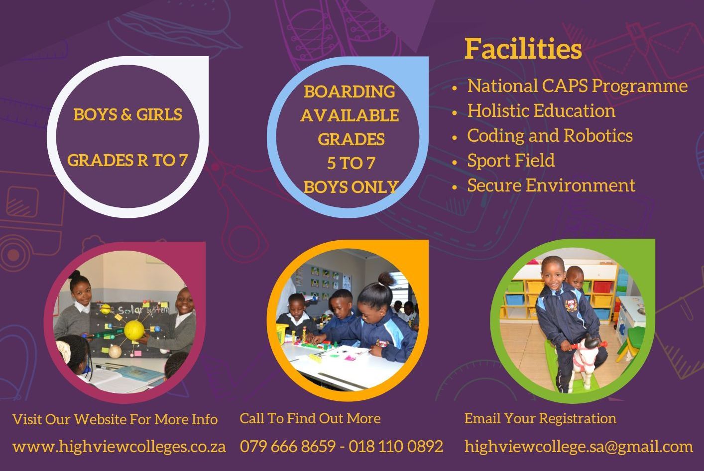 At Highview College, we take pride in nurturing young minds with a holistic approach to education. Our school caters to boys and girls from Grade R to Grade 7, with boarding facilities available for boys in Grades 5 to 7. Here, every child is valued, and their individual potential is celebrated in a safe, supportive, and inclusive environment.